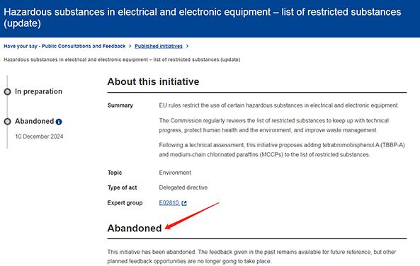 2024年12月10日,欧盟废弃了在RoHS中新增TBBP-A和MCCPs的提案。